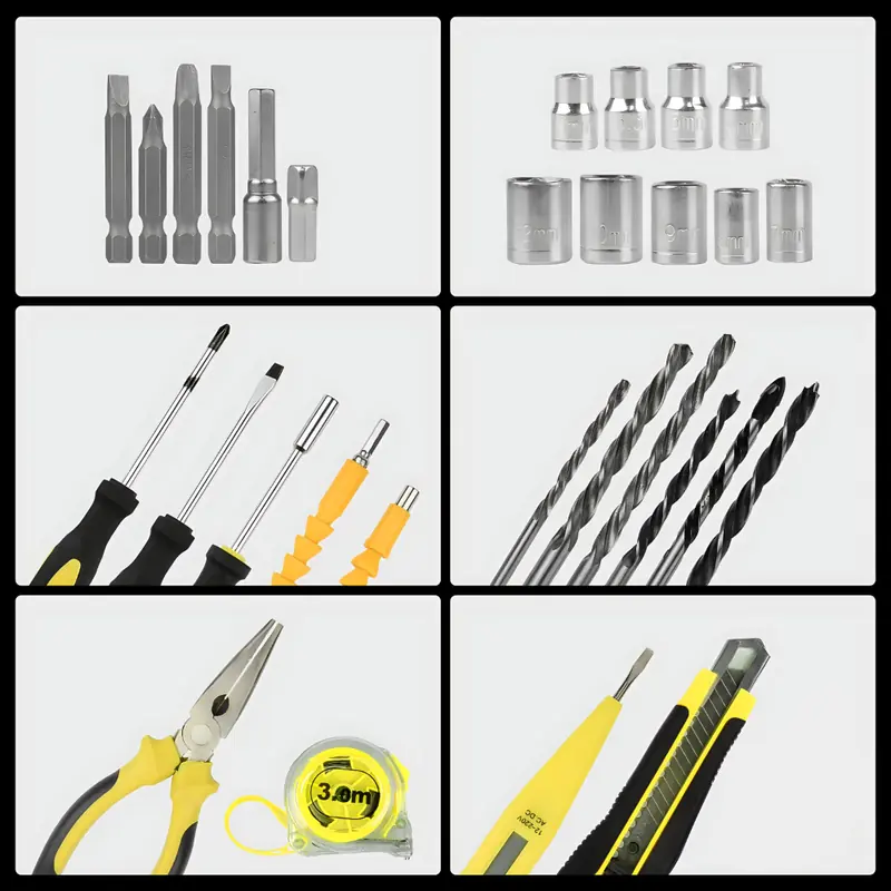 Komplet je osmišljen da bude spreman za rad odmah po otvaranju. U koferu ćete pronaći izbor burgija za drvo i metal, bitove za najčešće tipove vijaka, nasadne nastavke, merni metar, skalpel, izolacionu i univerzalnu traku, kao i osnovni ručni alat za sitne zahvate. Sve je pregledno raspoređeno kako biste uvek bili spremni za sledeći zadatak.