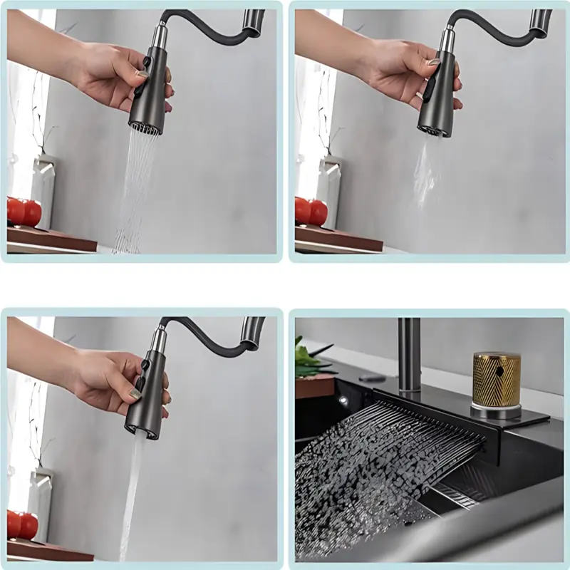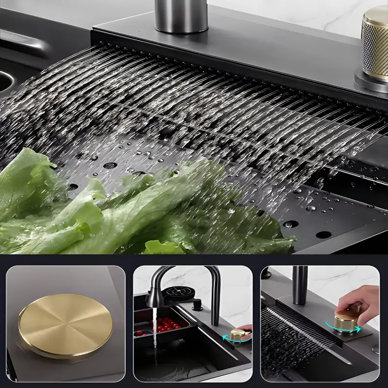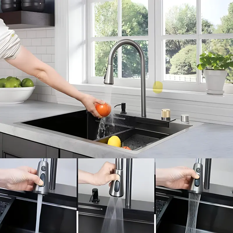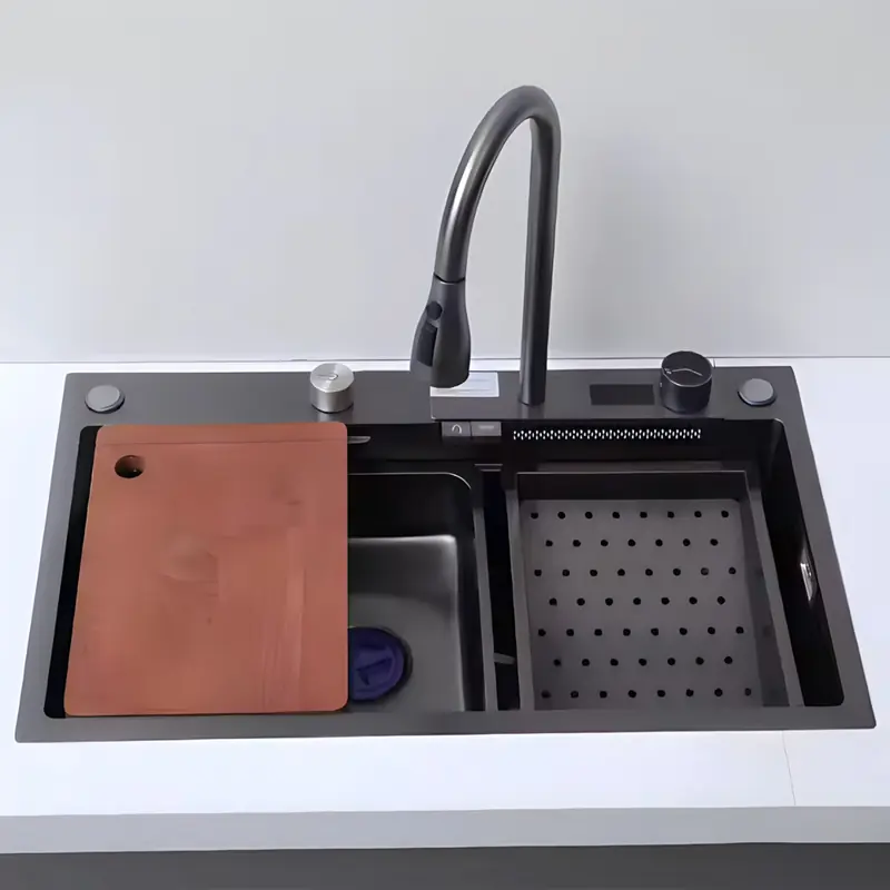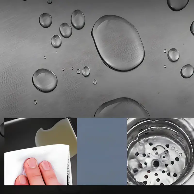 Minimalističke linije i crni PVD finiš naglašavaju moderan izgled, dok nerđajući čelik visokog kvaliteta (AISI 304) obezbeđuje izdržljivost za svakodnevnu upotrebu. Površina je otporna na ogrebotine i mrlje, lako se briše, a tihi jastučići i obloge smanjuju buku prilikom puštanja vode ili odlaganja posuđa. Zaobljeni uglovi olakšavaju čišćenje i sprečavaju zadržavanje prljavštine.
