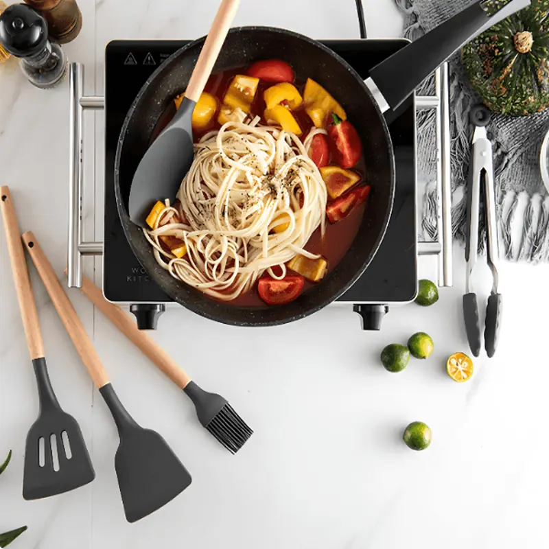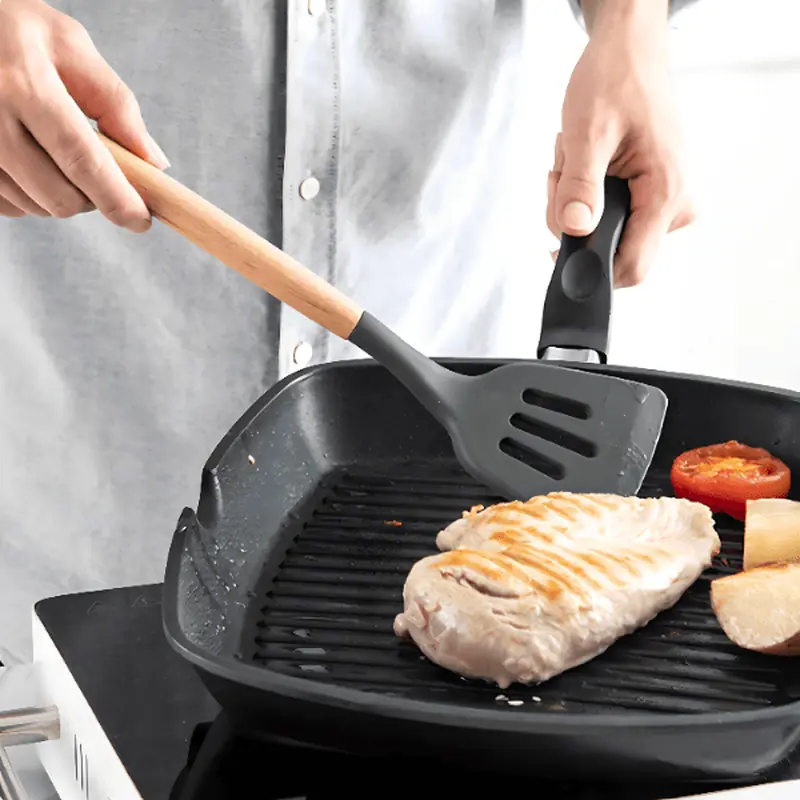 Od doručka do kasne večere, alati iz kompleta pomažu da svaki zadatak bude jednostavniji: nežno prevrtanje fileta, brzo mućenje dresinga, precizno serviranje paste ili suvog priloga. Drške se ne klizaju čak ni kada su vlažne, a balans težine smanjuje zamor ruke tokom dužeg rada. Za dodatnu sigurnost, radne ivice su glatke i fleksibilne, pa lako prate oblik posude i skupljaju svaki zalogaj.