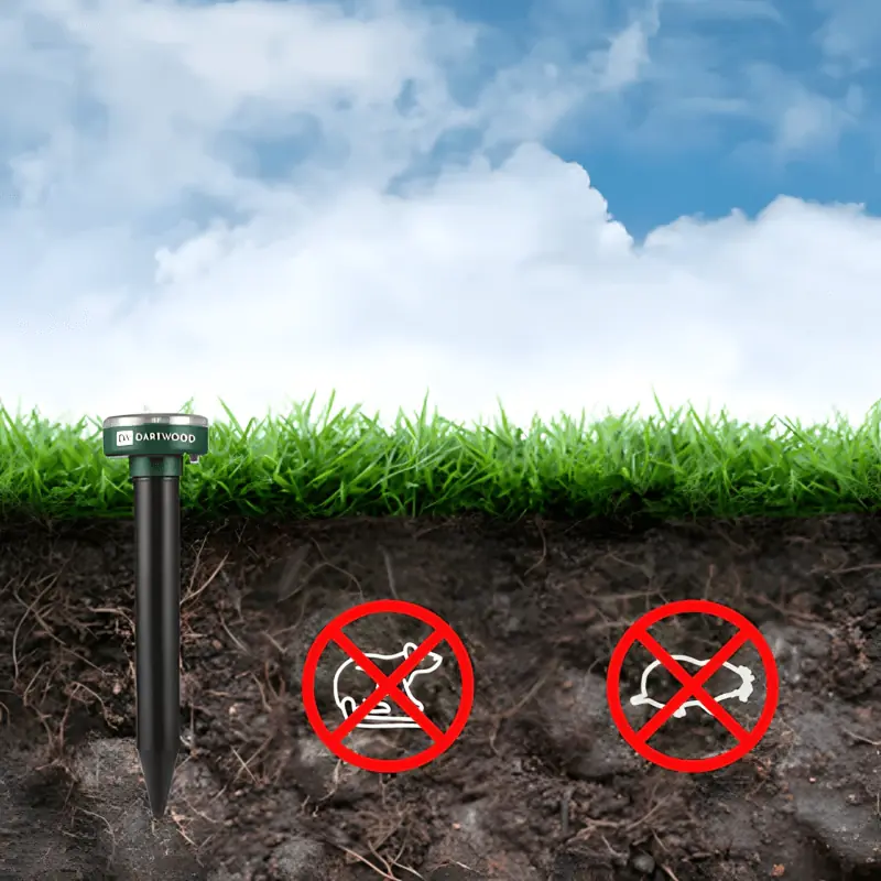 Jedan uređaj efikasno pokriva područje radijusa do približno 15 metara, u zavisnosti od strukture zemljišta (zbijenost, vlaga, prepreke). Uz set od dva komada, lako obuhvatate srednje ili veće površine: rasporedite ih na razmaku oko 15 m kako biste dobili ravnomernu zaštitnu zonu bez preklapanja mrtvih tačaka. Za neravne terene i delove sa gustom vegetacijom, po potrebi korigujte razmak.