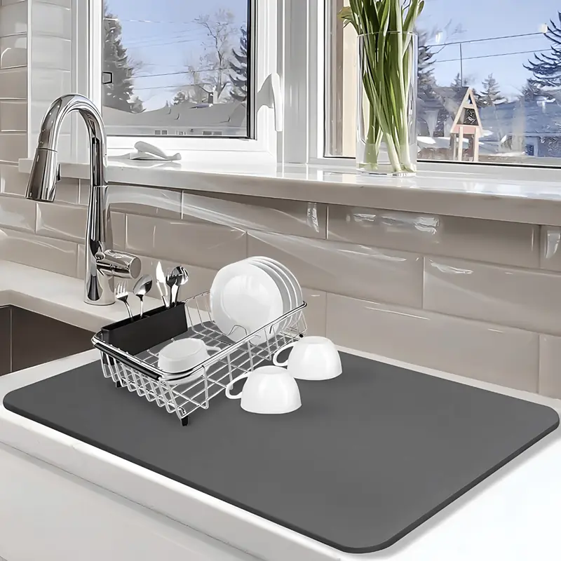 Kada sudovi brže otpuštaju vlagu, radna ploča ostaje suva, a kuhinja čistija. Podloga sakuplja kapljice i ravnomerno ih raspoređuje, sprečavajući zadržavanje vode i stvaranje neprijatnih mirisa. Stabilna je, nežna prema staklu i porcelanu, a istovremeno dovoljno izdržljiva za svakodnevnu upotrebu.