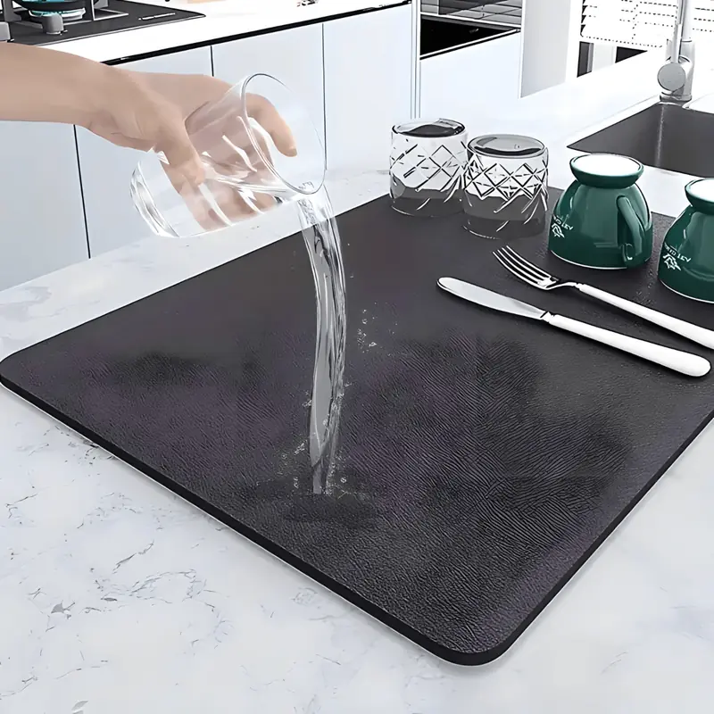 Napredna struktura materijala efikasno “uvlači” vodu i širi je na veću površinu, što ubrzava isparavanje. Rezultat je brzosušeća podloga koja posle kratke pauze ponovo spremno čeka narednu turu suđa. Voda jednostavno nestaje sa površine za svega nekoliko trenutaka – bez barica, curenja i neurednog pulta.